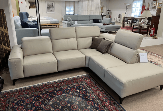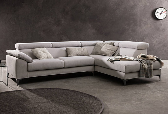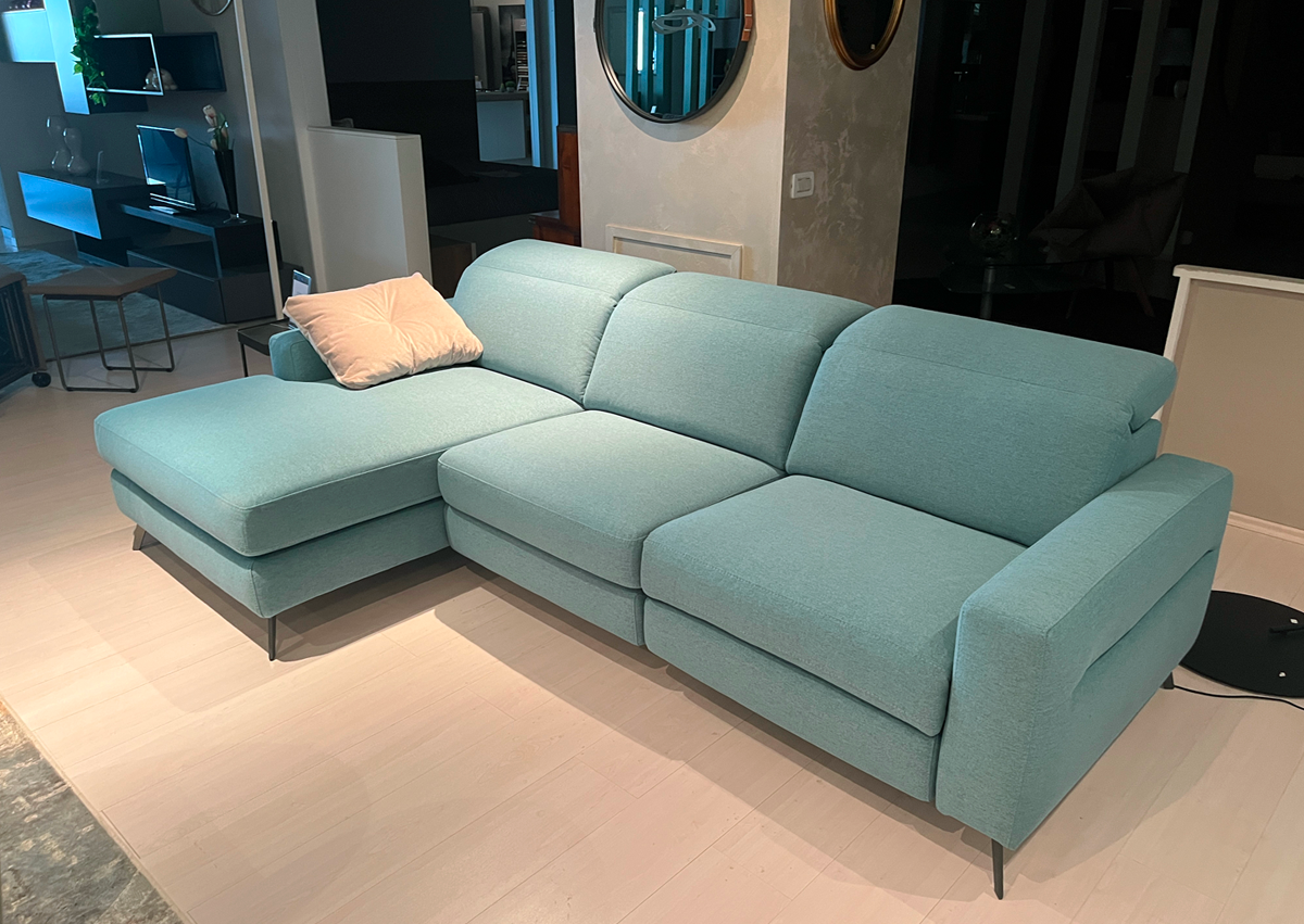 Comodo divano dallo stile minimalista. Si distingue per il comfort dato da più elementi: il pratico meccanismo relax sulla seduta e la chaise longue.